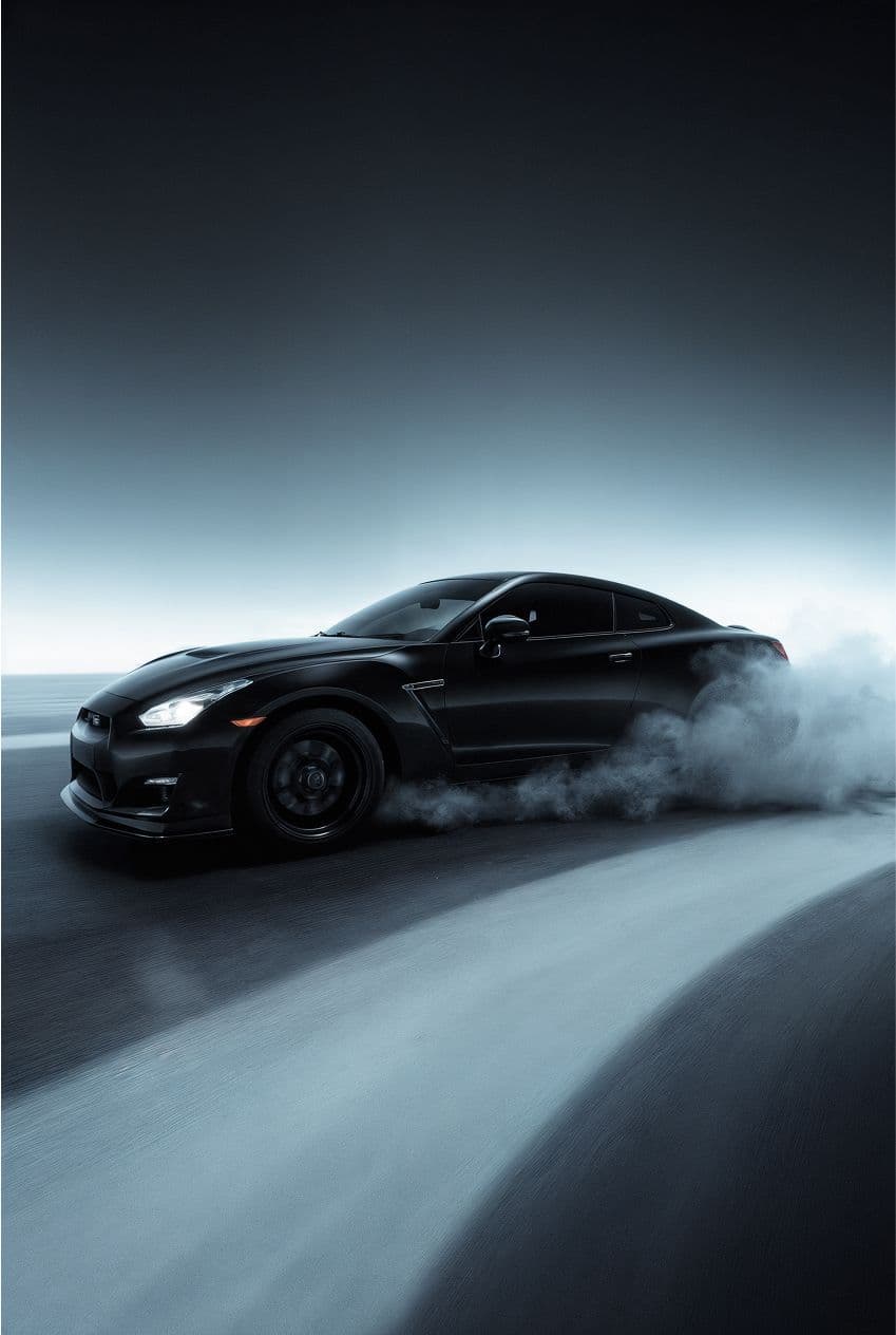 Hyperealistic extreme wide angle shot with depth colors and highly detailled textured studio light style of drifting car on futuristic minimal infinite gradient background, smooth transition from deep black or midnight blue at the top to a bright, luminous white at the bottom, with soft cool gray tones in between.