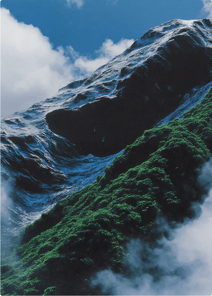 Landscape photography style of a steep mountain slope with lush green forest and rocky peaks, partially covered with fog and clouds under a bright blue sky.