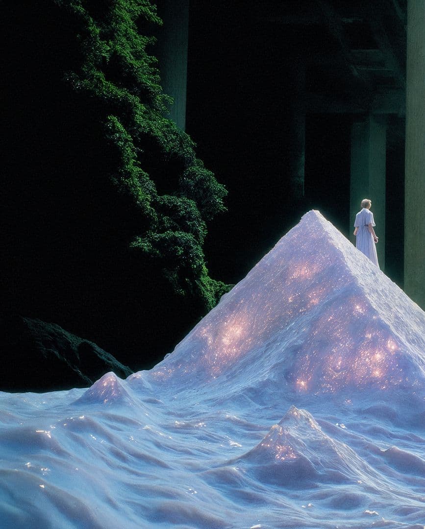 A magical Sci-fi landscape with an opal pyramid and a black forest in the background.