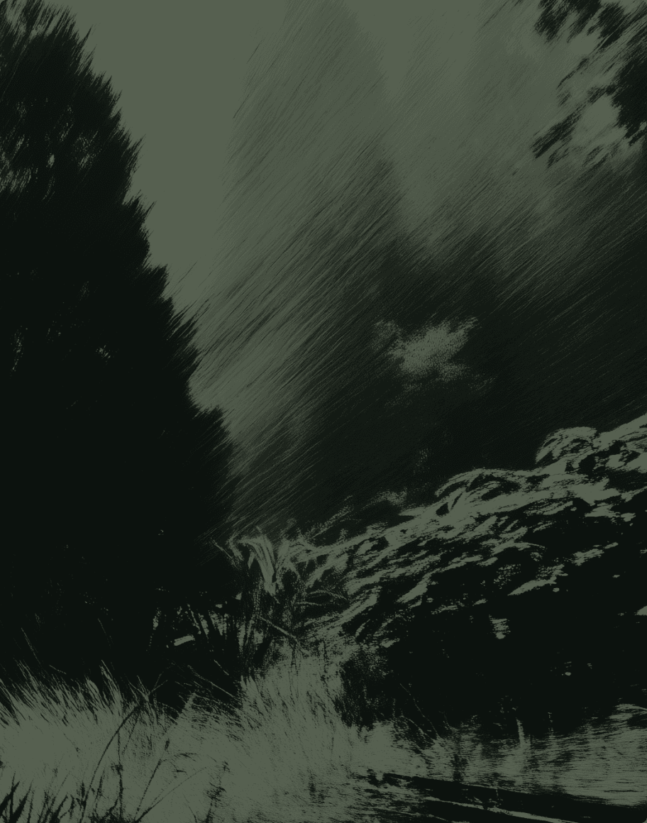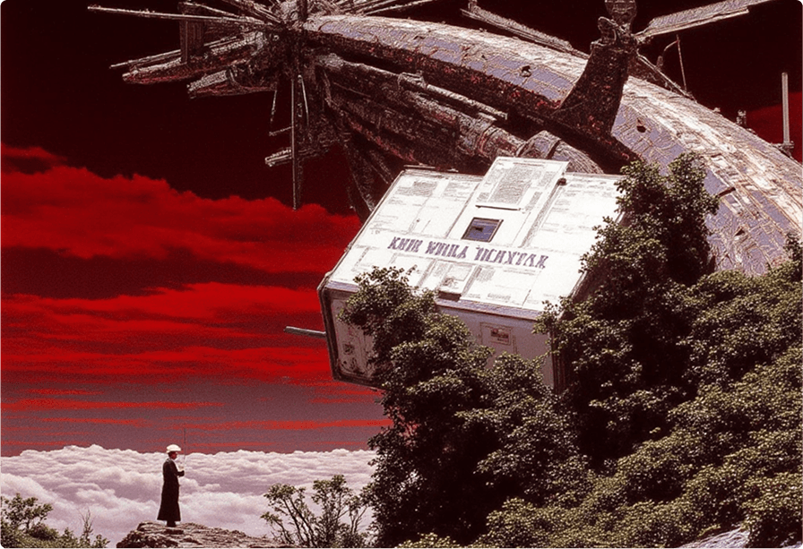 A surreal post-apocalyptic landscape with a dramatic crimson red sky and dark clouds. A massive, abandoned, and decaying futuristic spaceship crash-landed into a lush green forest, with a lone figure stands on a rocky gazing at the wreckage.