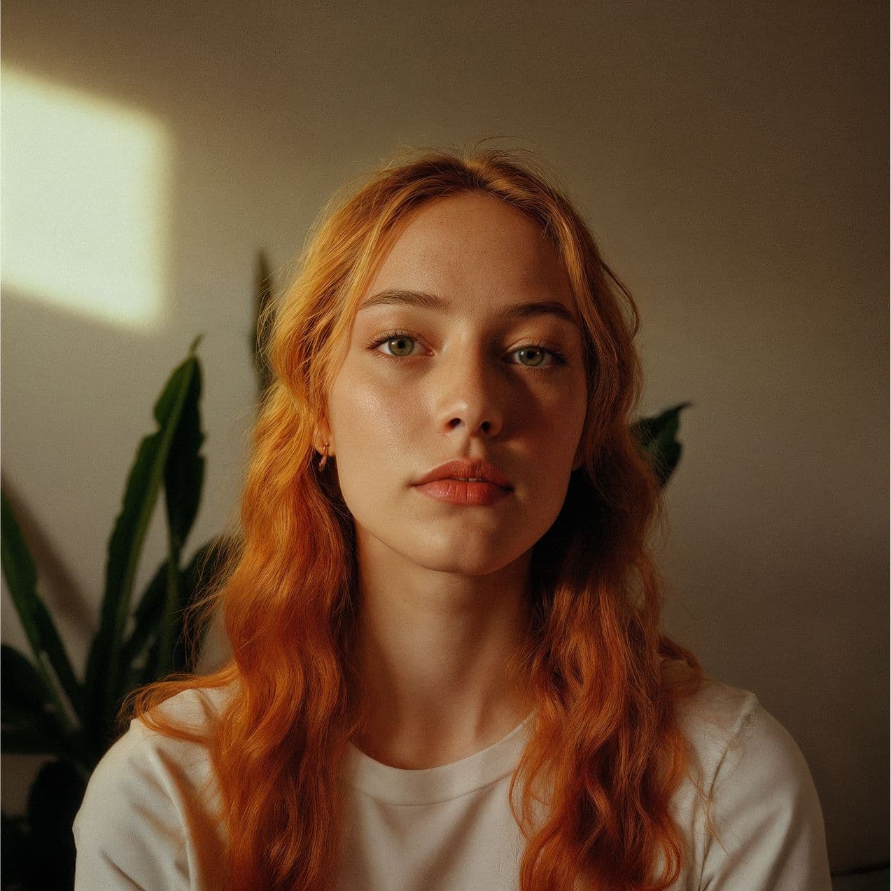 Close-up, natural-light, casual portrait-style photography of a girl whit orange hair on dreamy morning indoor background whit plants.