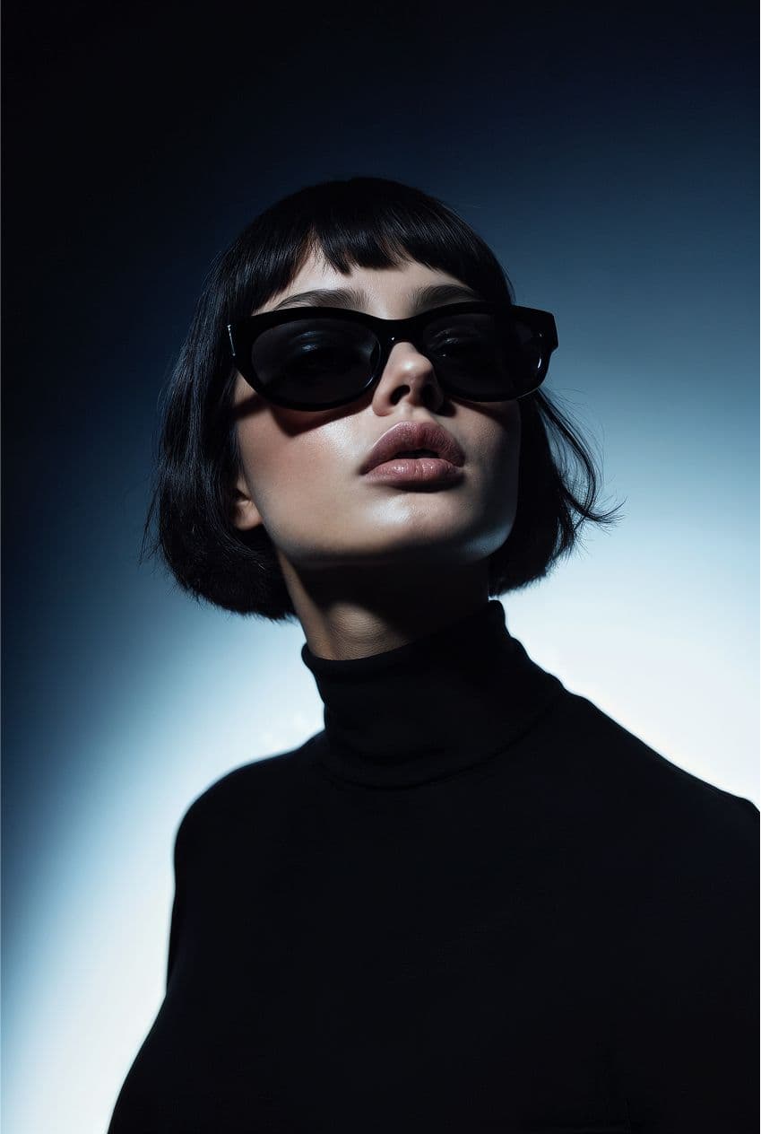 Hyperealistic close up shot with depth colors and studio light portrait style of woman wearing techwear on futuristic minimal infinite gradient background, smooth transition from deep black or midnight blue at the top to a bright, luminous white at the bottom, with soft cool gray tones in between.